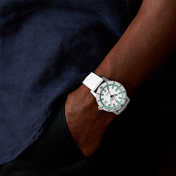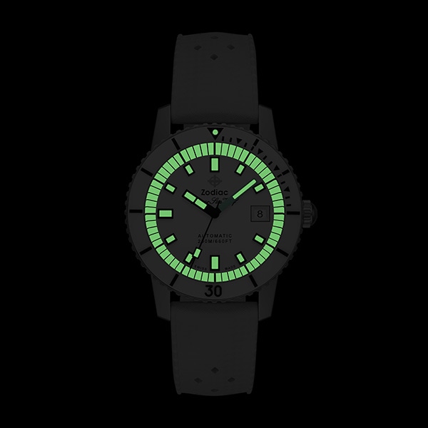40mm径のケースにSTP 1-21自動巻きムーブメントを搭載したZodiacのCOMPRESSION DIVER IIウォッチ。マットホワイトのダイヤルに、ホワイトのラバーバンドを組み合わせました。