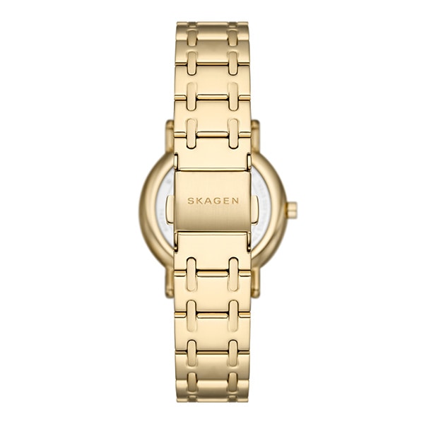 30mm径のケースに三針ムーブメントを搭載したSIGNATUR LILLE。ゴールドトーンのサンレイダイヤルに、ゴールドトーンのステンレススチール製ブレスレットを組み合わせました。ウォッチストラップは付け替え可能です。