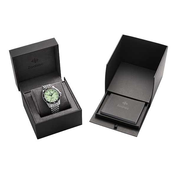 42mm径のケースにSTP 1-21自動巻きムーブメントを搭載したZodiacのPRO-DIVERウォッチ。スペアミントのダイヤルに、ステンレススチールブレスレットを組み合わせました。