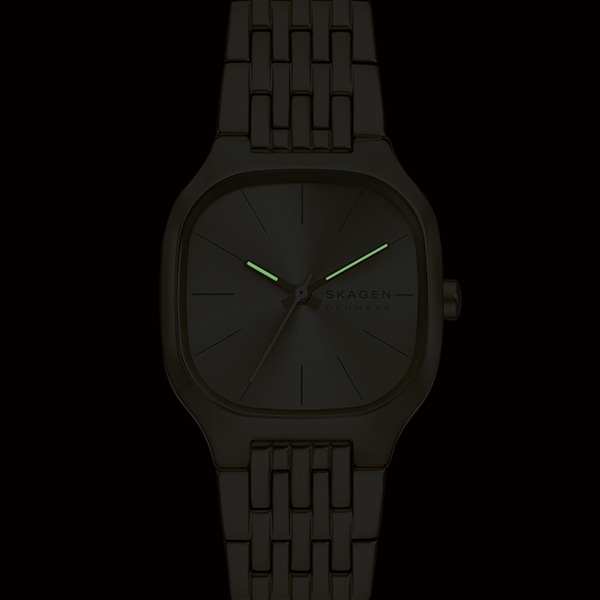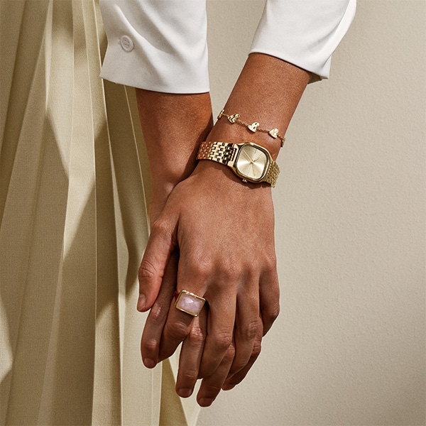 洗練されたモダンなデザインに仕上げたゴールドトーンのステンレススチールウォッチ。存在感が際立つアイテムです。丸みのある28mmのスクエアケースに三針ムーブメントを搭載し、ゴールドトーンのサンレイダイヤルを組み合わせました。