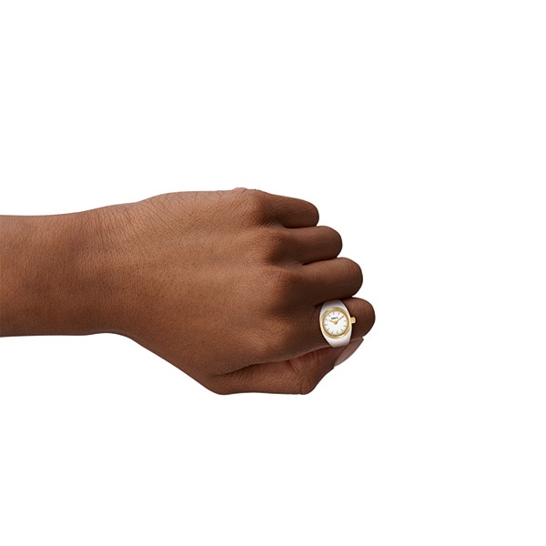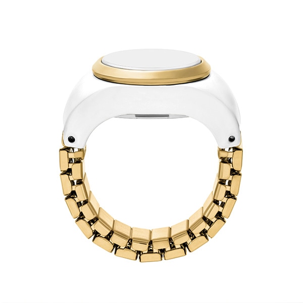 洗練された輝きを放つ、スリークなウォッチリング。ファッション性と機能性が見事に融合しています。光沢のあるホワイトエナメルとゴールドトーンのステンレススチールを使用したバンドが、エレガンスと実用性の絶妙なバランスを実現。50メートル防水機能を備えた、普段使いに最適なワンランク上のアクセントアイテムです。
