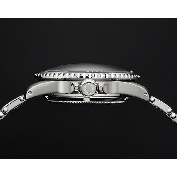 1960年代の往年のダイバーズウオッチをモチーフに、ブラックベゼルでダイバーズウオッチの王道ともいえるスタイルを表現。艶のないしっとりとしたブラックに仕上げているためより落ち着いた雰囲気が楽しめます。このモデルはドットインデックスタイプです。