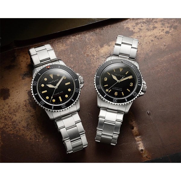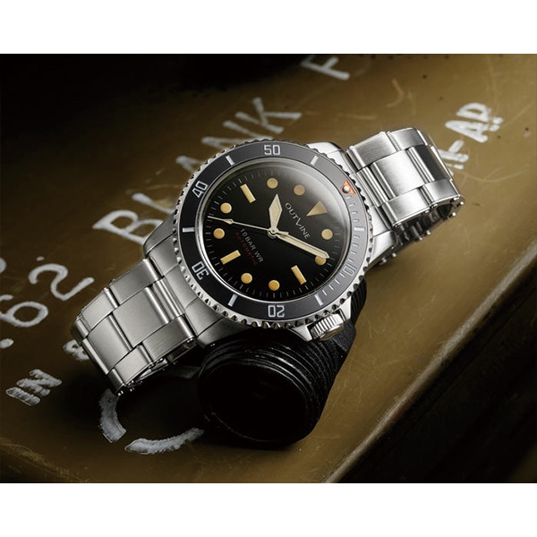 ムーヴメントにはセイコーエプソン製の機械式自動巻きムーヴメント、Cal.YN55Aを搭載。また時計のバリエーションは各ベゼルともにインデックス違いで2種類を用意しました。ドットとバーを組み合わせた往年のスタンダードタイプと、一部に3・6・9を使用した軍用のサブマリーナータイプです。もちろん1950年代のものを復刻したアウトラインオリジナルのリベットブレスがセットされており、レトロ感がぐっと際立った魅力的な作りとなっております。