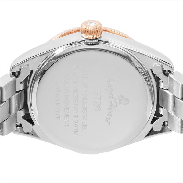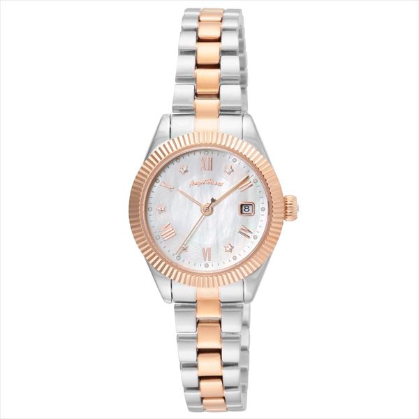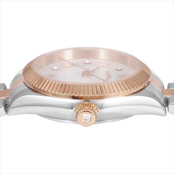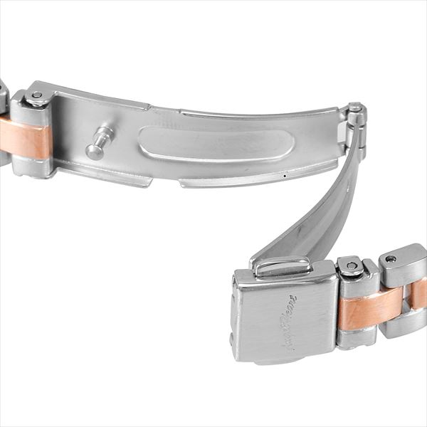 ダイヤモンドカットされたベゼルが腕元を華やかに彩ります。星型のインデックスや光の当たり具合で7色に輝く天然パールの文字盤もポイントです。マット加工されたツートンカラーのブレスが高級感を増幅します。