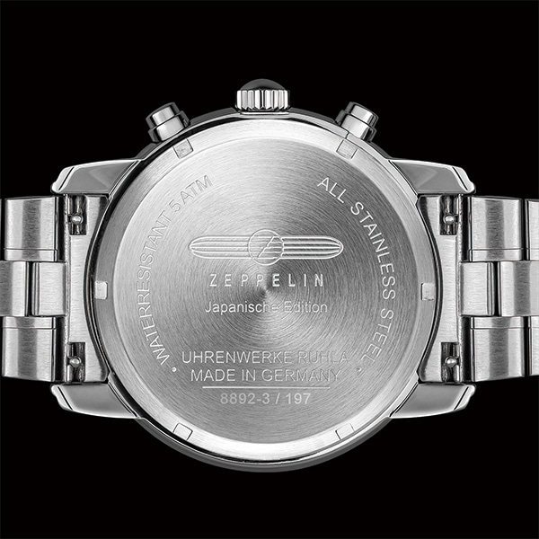ベースは熱烈な支持を得ている日本限定クロノグラフ。径42mmのケース内に秒針、12時間計、30分計の3カウンターを収めました。ストレートのペンシル針は、シンプルでいて抜群の視認性を誇ります。あらゆる造形に、実用性を尊ぶツェッペリンらしい姿勢が現れています。