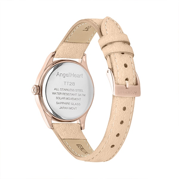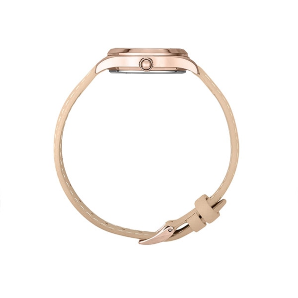 チックタック別注モデル。シーズンレスなオンオフ問わず使用しやすいデザインで初めての腕時計にもおすすめ。スタッズやクリスタルを採用した大小さまざまなインデックスによってシンプルかつ程よい洒落感を演出。オンオフ問わず着用できる1本。別注モデルはピンクゴールドケースに淡いペールピンクのレザーストラップを合わせました。甘くなり過ぎずないフェミニンなデザインです。