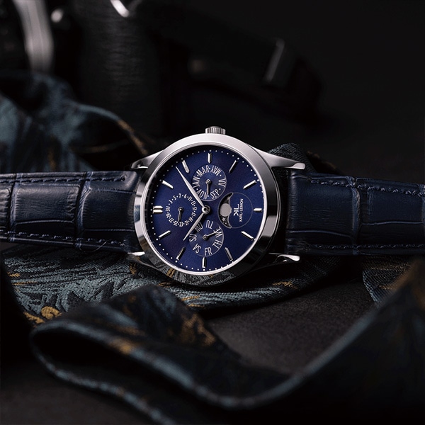 日・曜日・月を表すマルチファンクションに月の満ち欠けがわかるムーンフェイズを搭載したクラシック時計。サファイアガラス使用。クラシックのケースデザインにムーンフェイズ機能を搭載したエントリープライスのドレスウォッチです。