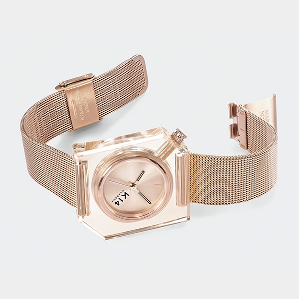 KLASSE14で人気の新シリーズ『K14』に、ひと回り小さめの34ミリケースが加わります!不規則な6角形と独創的なクリアケースデザインはそのままに、サイズダウンでミニマルなかわいらしい印象をプラス。40ミリケースと同色展開でペアウオッチとしてもおすすめ!17mm幅のストラップとの交換も可能なので様々な組み合わせが楽しめます!