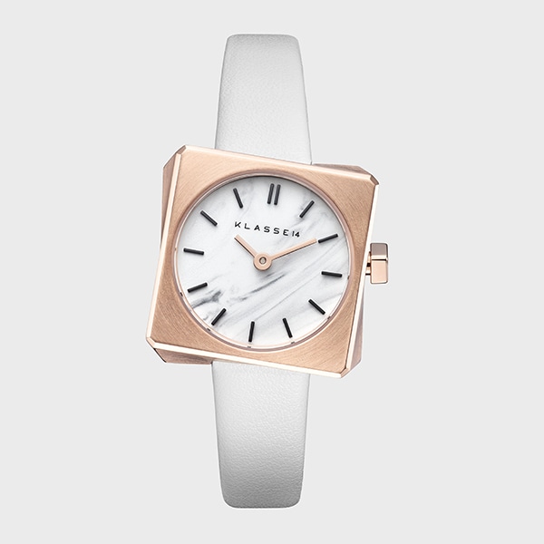 KLASSE14の新コレクションSPIN(スピン)。スクエアケース・文字盤そのものをスピンさせると言う遊び心満載で大胆なデザイン。ケースは25.5mmとブランド最小のサイズです。カラーは人気のローズゴールド・シルバーのメッシュストラップ。新エレメンツを採用したマーブル文字盤のホワイト&ブラックレザーストラップの4色展開。レザーストラップは廃棄予定だった有機リンゴの皮を、アップサイクルすることで生まれたサステナブルなAppleskin(アップルスキンレザー)をKLASSE14で初採用。地球に優しいニューフェイス”SPINが発売です!