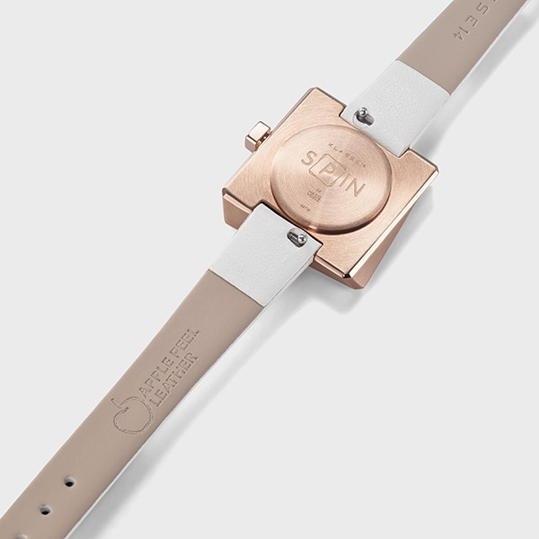 KLASSE14の新コレクションSPIN(スピン)。スクエアケース・文字盤そのものをスピンさせると言う遊び心満載で大胆なデザイン。ケースは25.5mmとブランド最小のサイズです。カラーは人気のローズゴールド・シルバーのメッシュストラップ。新エレメンツを採用したマーブル文字盤のホワイト&ブラックレザーストラップの4色展開。レザーストラップは廃棄予定だった有機リンゴの皮を、アップサイクルすることで生まれたサステナブルなAppleskin(アップルスキンレザー)をKLASSE14で初採用。地球に優しいニューフェイス”SPINが発売です!
