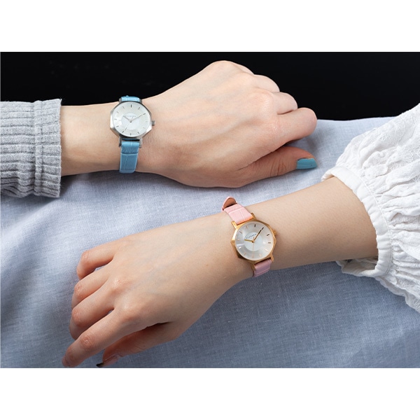 8角形ケースが目を引くVolare OKTO MOP(Mother of Pearl) モデルより、人気の文字盤Colorに春らしいレザーストラップを 組み合わせたNew Colorが登場!