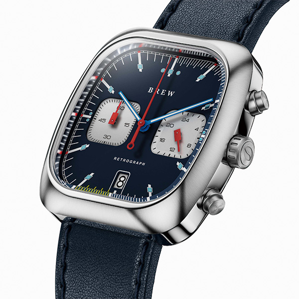 1970年代スタイルのクッションケースにマットブルーのダイヤルとシルバーのサブダイヤルを組み合わせたクロノグラフ。レトロさと実用性を両立させた、エスプレッソの25~35秒抽出タイムを計測できる機能美ウォッチです。