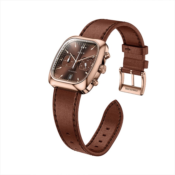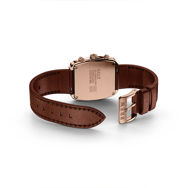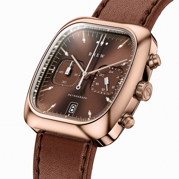 ブラウンのサンバースト文字盤にローズゴールドPVDケース、茶色レザーストラップを組み合わせた“エスプレッソ”クロノグラフ。ヴィンテージ感漂うクッションケースに、25~35秒のエスプレッソ抽出タイムを視覚化する実用美を凝縮した設計です。