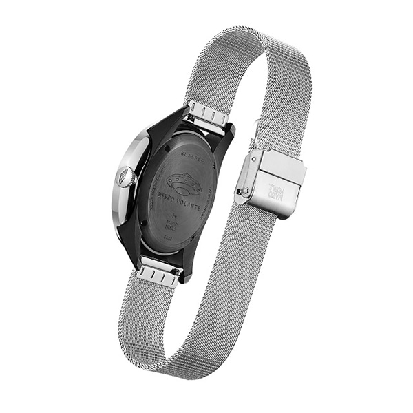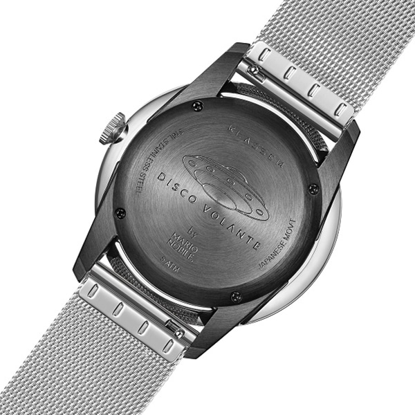 KLASSE14デザイナーのマリオは10代の頃UFOの話に魅了されていました。大気中に静かに高速で浮遊することのできるUFOに想いを重ね、ディスコボランテ(英語名:フライングソーサー)と命名。デザインはフライングソーサー形を模したバックケースとドーム型のレンズが特徴的。UFOフィーバーの起こった50-60年代を想起させるヴィンテージ感もポイントです。今回のメッシュベルトは、ビジネスシーンだけでなくプライベートのスタイリングにも使えるデザイン。付属の型押しレザーベルトに付け替えれば、また違った表情を楽しめます。