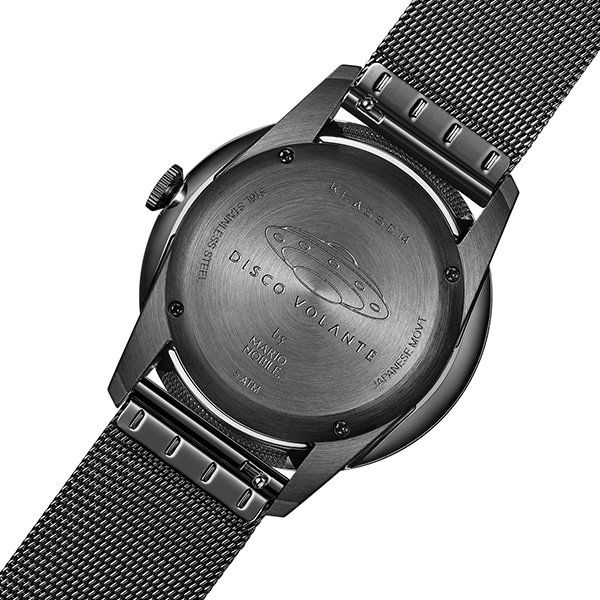 KLASSE14デザイナーのマリオは10代の頃UFOの話に魅了されていました。大気中に静かに高速で浮遊することのできるUFOに想いを重ね、ディスコボランテ(英語名:フライングソーサー)と命名。デザインはフライングソーサー形を模したバックケースとドーム型のレンズが特徴的。UFOフィーバーの起こった50-60年代を想起させるヴィンテージ感もポイントです。今回のメッシュベルトは、ビジネスシーンだけでなくプライベートのスタイリングにも使えるデザイン。付属の型押しレザーベルトに付け替えれば、また違った表情を楽しめます。
