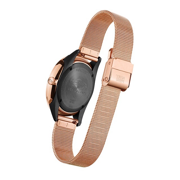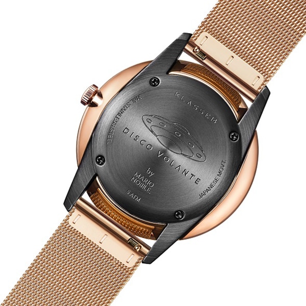 KLASSE14デザイナーのマリオは10代の頃UFOの話に魅了されていました。大気中に静かに高速で浮遊することのできるUFOに想いを重ね、ディスコボランテ(英語名:フライングソーサー)と命名。デザインはフライングソーサー形を模したバックケースとドーム型のレンズが特徴的。UFOフィーバーの起こった50-60年代を想起させるヴィンテージ感もポイントです。今回のメッシュベルトは、ビジネスシーンだけでなくプライベートのスタイリングにも使えるデザイン。付属の型押しレザーベルトに付け替えれば、また違った表情を楽しめます。