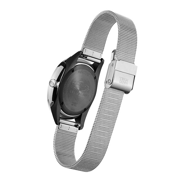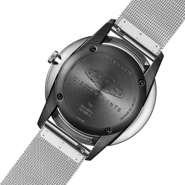 KLASSE14デザイナーのマリオは10代の頃UFOの話に魅了されていました。大気中に静かに高速で浮遊することのできるUFOに想いを重ね、ディスコボランテ(英語名:フライングソーサー)と命名。デザインはフライングソーサー形を模したバックケースとドーム型のレンズが特徴的。UFOフィーバーの起こった50-60年代を想起させるヴィンテージ感もポイントです。今回のメッシュベルトは、ビジネスシーンだけでなくプライベートのスタイリングにも使えるデザイン。付属の型押しレザーベルトに付け替えれば、また違った表情を楽しめます。