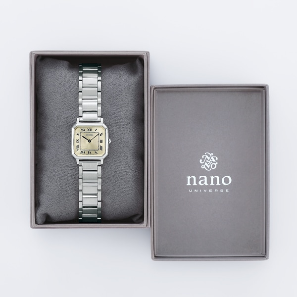 人気セレクトショップ「ナノ・ユニバース」とコラボレーションをした、ヴィンテージスタイルの電池式クオーツ第3段が登場。デザインテーマ:My Favorite Vintage時代を超えて愛されるヴィンテージスタイルの時計を目指して、人気セレクトシップ「ナノ・ユニバース」とコラボレーションをしたモデルです。ケース形状・メタルバンド・レザーストラップ色・ダイヤルカラーを「ナノ・ユニバース」でセレクト。1970年代後半のアーカイブから着想した八角形のケースが、懐かしさを高級感を感じさせるモデルとなっております。ダイヤル中央には放射状の型打ちを施し、立体感のある仕上がりを目指しました。太めのオールローマ数字のインデックスも、1970年代後半のアーカイブから着想したもので、八角形のケースに合わせて見やすいレイアウトになるようこだわりました。針はバット針にすることで、スマートな印象に仕上げています。ナノユニバースコラボレーション初の採用となるメタルブレスレットは、存在感のあるつややかな3列タイプを採用。質感の良い無垢のブレスレットで、ジュエリーとのコーディネートを楽しめる2色展開です。レザーバンドは、質感・型押しの柄・色味にこだわって、上質な雰囲気で身につけられる1本になるようセレクトしております。
