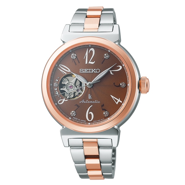 ダイヤルは、すっきりエレガントな佇まいのアラビアフォントと、淡いピンク~透明のクリスタルガラスを組み合わせたルキアで人気のレイアウトです。9時位置にオープンハートをレイアウトし、メカニカルらしい表情が楽しめるデザインとなっています。その左側にはクリスタルガラスとともに植え略字をレイアウトし、ルキアならではのビジュー感あるオープンハートのデザインとなっていまケースはコの字型のカン足フォルムを採用し、ボリューム感のあるケースでありながら軽やかさを感じさせます。