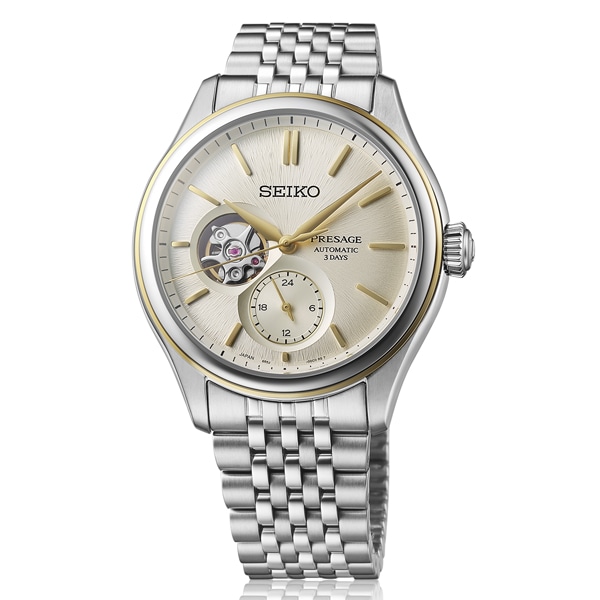 針やインデックスをダイヤルの曲面に合わせてカーブさせることで、ダイヤル全体が柔らかな光で輝きます。型打ちには日本の伝統的素材である絹に着目した新しい模様を開発。3カレは絹織物の生地を、オープンハートは生糸の質感をイメージしております。また、立体成型ダイヤルの曲面に型打ち模様を組み合わせることで、独自の深い味わいを実現。ケースは柔らかな曲面で構成された、思わず指先で触れたくなるような親しみやすさを感じられる造形となっております。バンドは70年代のメタルバンドをイメージしたレトロ感のある繊細な多列バンドを採用。量感と高級感を備え、着用性にも配慮したデザインとなっております。