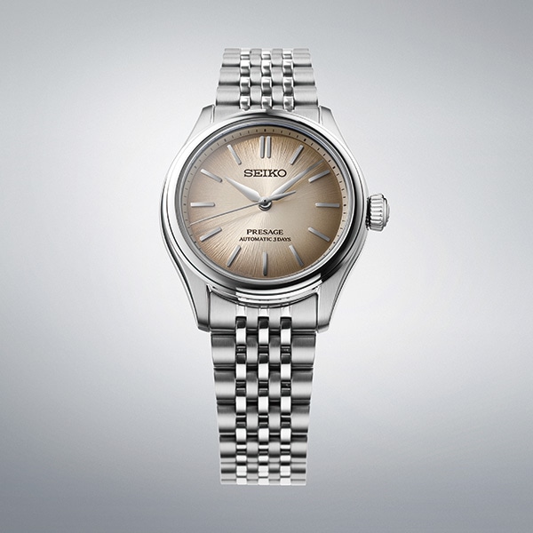 クラシックシリーズより、トラッドな趣向にマッチする小径サイズ(36mm)モデルが登場。ダイヤルの型打ちは小径サイズでも見ごたえのある、絹糸をイメージした繊細な放射模様を施しました。ダイヤルの美しさを最大限引き出すため、あえてカレンダー表示を無くし、ヴィンテージテイストを表現しています。ダイヤルカラーには、柴木で染めたくすんだ茶色で、江戸時代に流行した柴色を採用。奥深いダイヤルとレトロ感のある繊細な多列ブレスレッドが、トラッドな雰囲気を醸成します。