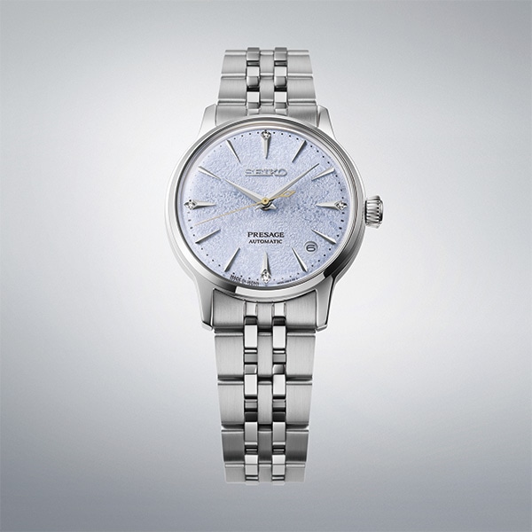 夏のフローズンカクテルをイメージした34㎜サイズモデルが登場。夏らしいフローズンカクテルを意識したクラッシュした氷の表情を思わせる、オリジナリティある型打ちと、さわやかなダイヤルの色味が特徴です。ダイヤをセッティングする4か所の角台座とV字形状略字を今回新しく考案。カクテルタイムのアイコンであるくさび形状の略字はキープしています。ブレスレット形状は、コマのバランスを見直し、テーパーをかけ、より軽やかにアップデートしました。ケースの厚みを軽減するため、通常のスクリュー金属裏ぶたを採用しています。