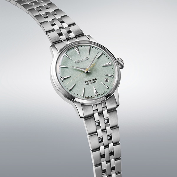 夏のフローズンカクテルをイメージした34㎜サイズモデルが登場。夏らしいフローズンカクテルを意識したクラッシュした氷の表情を思わせる、オリジナリティある型打ちと、さわやかなダイヤルの色味が特徴です。ダイヤをセッティングする4か所の角台座とV字形状略字を今回新しく考案。カクテルタイムのアイコンであるくさび形状の略字はキープしています。ブレスレット形状は、コマのバランスを見直し、テーパーをかけ、より軽やかにアップデートしました。ケースの厚みを軽減するため、通常のスクリュー金属裏ぶたを採用しています。