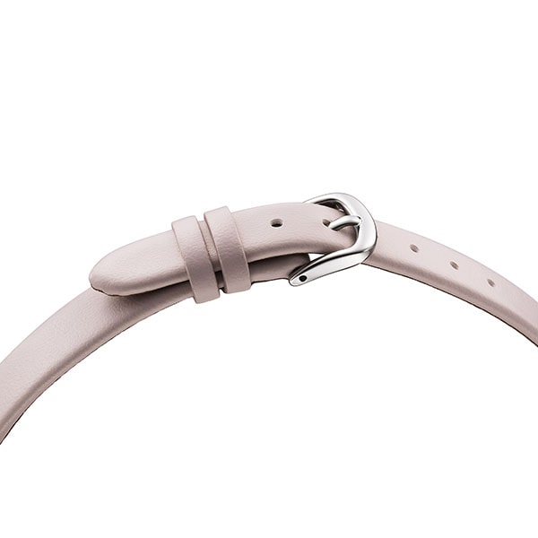 フレッシャーズにもぴったりの可愛らしさと視認性を両立した、デイト付きのベーシックなモデルが登場。大きめのアラビア数字インデックスは視認性バツグン。文字板の外周部分にさりげなく描かれたお花のパターンが華やかさを演出します。時分針は夜光付きで、暗い場所でも時刻がしっかり確認できます。「素敵なご縁がありますように」と「合格」の2つの意味を込めて、5時位置にさりげなくハートのマークをあしらっています。環境にも配慮し、バンドにはペットボトルのリサイクル素材「エコペット」を使用。甘すぎないスモーキーピンクはどんな服にも合わせやすく、使い勝手の良いカラーです。