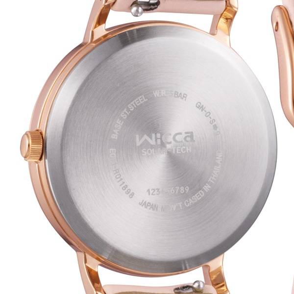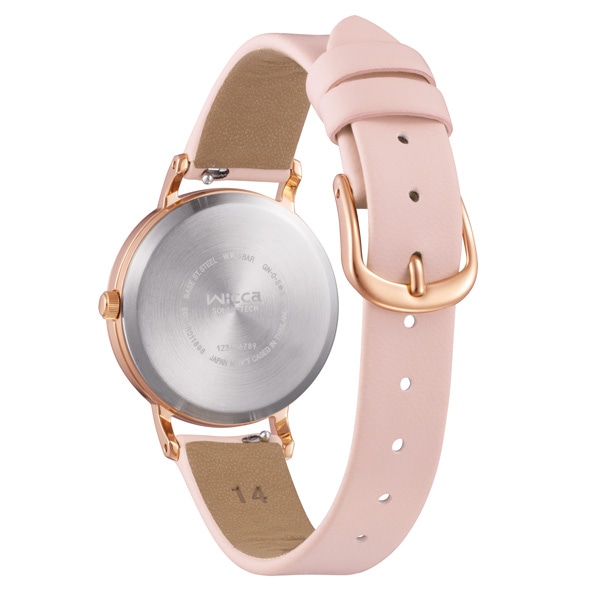 ウィッカで人気ナンバーワンのカジュアルファッションに合わせやすいモデルに新色が登場しました。ケースサイズが約30mmと少し大きめサイズです。人気のソーラーテック対応モデルで、カジュアルファッションにあわせやすいシンプルなデザインの新配色です。文字板12時の位置に1ポイントのダイヤモンド、3・6・9時の位置には輝くカットパーツを配置。透明感のあるシンプルなデザインを施し、ピンクゴールドのケースとあわせることでトレンド感も取り入れました。肌なじみが良いピンクのバンドは、環境に配慮した合成皮革「エコペット(ECOPET)」を使用しています。