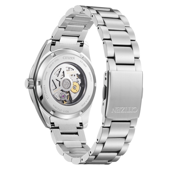 高振動と薄さが特徴のムーブメントCal.9011を搭載した「シチズン コレクション」メカニカルモデルの新色で、落ち着いた大人の雰囲気を醸し出す“グレー”は、機械式時計を初めて購入する人にもおすすめの1本です。メンズウオッチとしては少し小さめの38mmケース。シンプルな3針の王道デザインがオンとオフのさまざまなシーンにマッチし、幅広い年齢層に合います。ケースとバンドはデュラテクト仕様。細かくかき分けられたミラー面も傷が付きにくく、本来の美しさが長続きします。