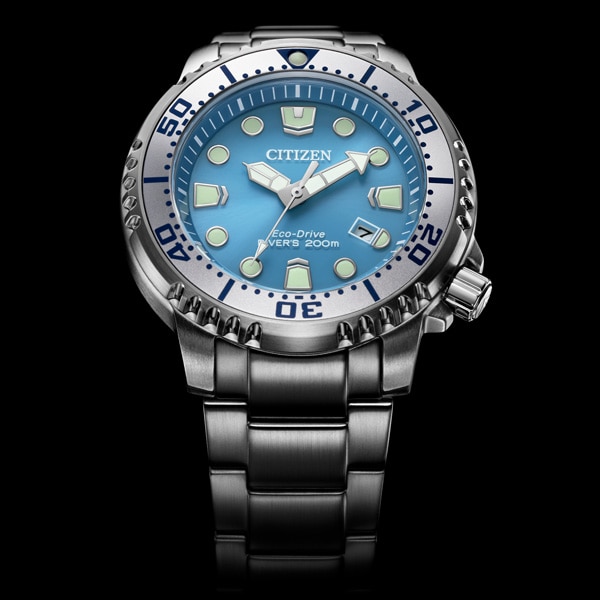 機能性、耐久性、安全性を兼ね備えた本格スポーツウオッチ、シチズン PROMASTER(プロマスター)。全世界で人気のダイバーモデルから、氷河や氷の洞窟をモチーフにデザインしたメタルバンドモデルが登場しました。自然豊かな氷河や氷の洞窟からインスピレーションを受けたシリーズです。バンドにはラチェット付のメタルバンドを採用。アクティブなシーンはもちろん、デイリーユースでも活躍できるモデルです。逆回転防止ベゼルやねじロックりゅうずなど、ダイビング中の安全性を考慮した本格機能も充実しています。氷河や氷山などの色味を表現した、爽やかなアイスブルーの文字板。ベゼルのアルミニウムリングにはあえて色を入れずにケースと同色で仕上げ、文字板の存在感を際立たせました。
