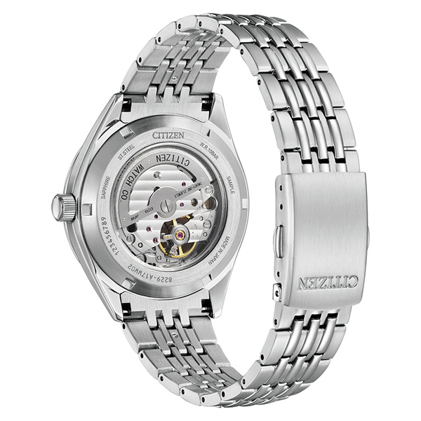 秒停止機能を搭載したキャリバーを搭載。クラシックなテイストが人気のメカニカルウオッチがデザインをリニューアルしました。文字板7時の位置から、メカニカルウオッチの心臓部であるテンプの繊細な動きを堪能できるオープンハート仕様。12時の位置から6時の方向へ縦に描いたパターンがクラシックな印象を演出しています。実用性の高いメタルバンドに、ブラックとブルーの文字板を合わせたベーシックなデザイン。裏ぶたは、回転する錘(おもり)部分とメカの動きを楽しめるシースルーバックを採用しています。