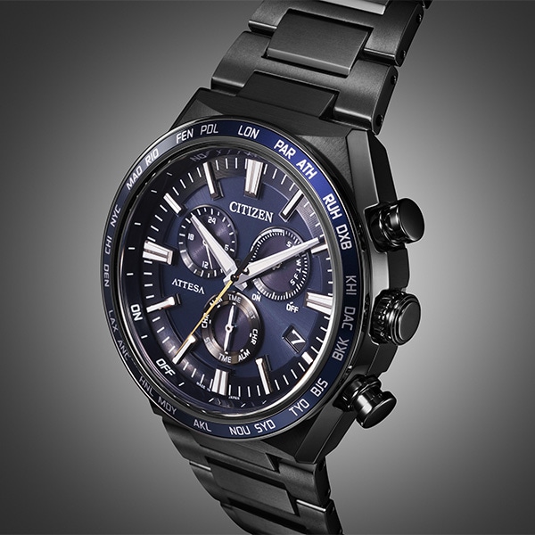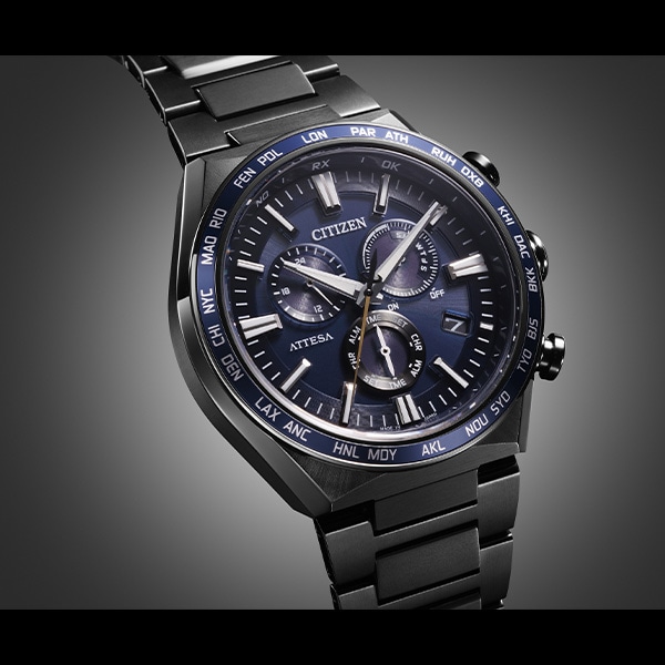 ケースとバンドのアウトラインを一体化し、エッジを効かせたフルフローケースを採用。スポーティな印象とさりげない個性をプラスしています。ブラックチタン?シリーズのDLCモデルは、大人っぽいダークブルーの文字板にアクセントとしてゴールドの秒針を合わせて高級感を演出しています。