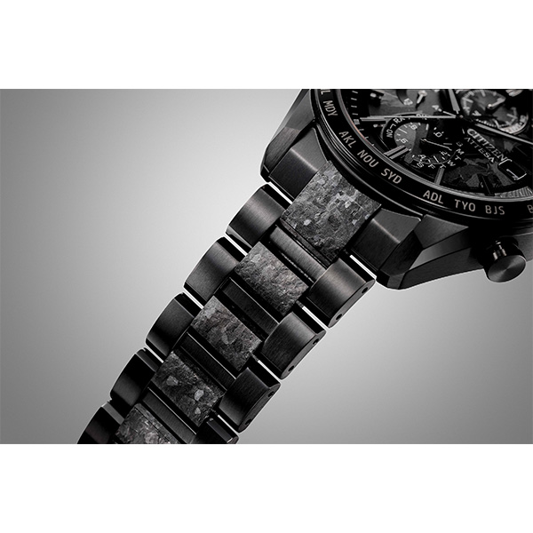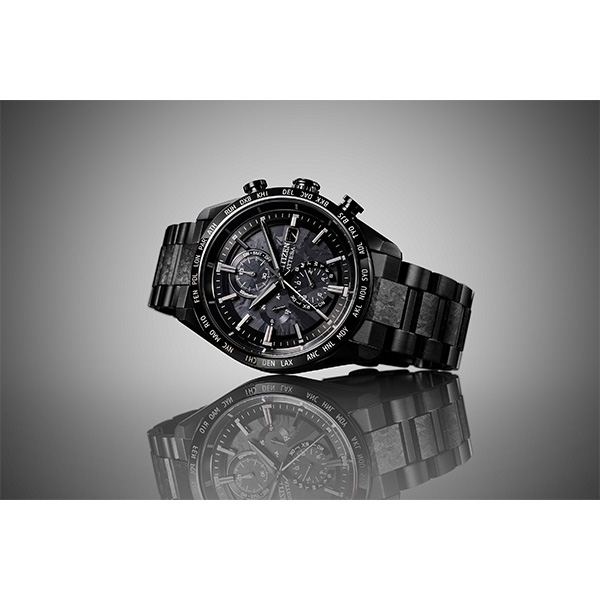 ブラックの文字板に結晶チタニウムをイメージした成形型による結晶柄をデザイン。その上にブラックの小部品を重ね、多彩なブラックが織り成す表情豊かなモノトーンに仕上げています。文字板には円弧状に輝くシルバーのアクセントをプラス。闇の先に見える光を表現しています。裏ぶたにはHAKUTO-Rのロゴをデザインしています。