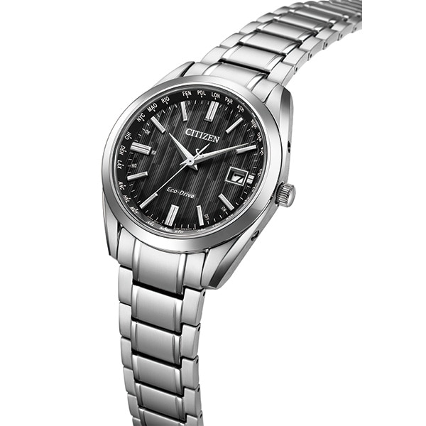 ケースとバンドにスーパーチタニウムを採用した、ベーシックな3針タイプのエコ・ドライブ電波時計。縦方向にパターンをあしらったシンプルで見やすい文字板でビジネスシーンはもちろん、日常の幅広いシーンにフィットするデザインです。ベゼルとバンドにミラー面をプラスすることで、上質感を演出しています。