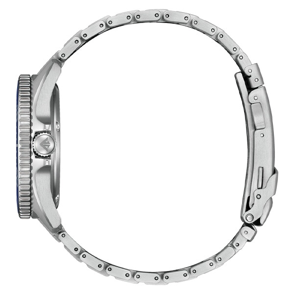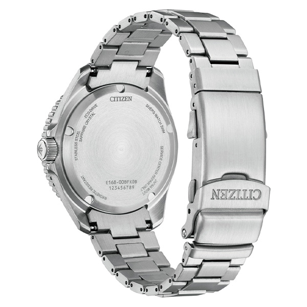 コンパクトなサイズ感と正統派のデザインにこだわった、エコ・ドライブ ダイバー200m。回転ベゼルは、外周全体にやや深めの溝を刻んだオーソドックスな仕上がりで、優れた操作性も実現しています。3連メタルバンドは、別体構造の中駒を用い、斜面をミラー仕上げにした立体感のある力強いデザイン。バックルは、ダイビングスーツを着用した際なども簡単に調整・装着できるラチェット付ダブルホールディングバックルを採用しています。中心から外側にかけてグラデーションを施した文字板は、深く澄んだ海中を表現。シンプルながらも高級感のあるフェイスに仕上げています。