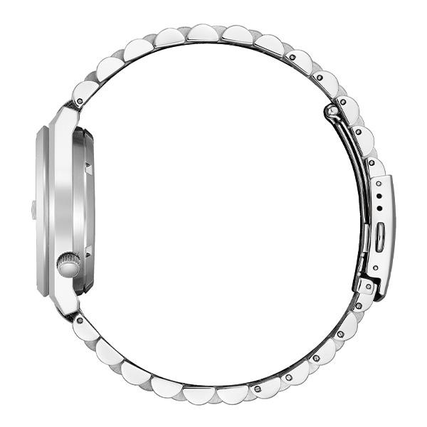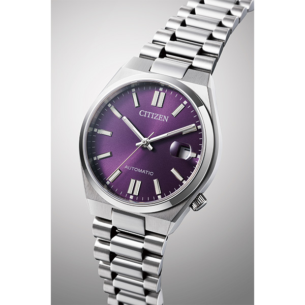 メタリックな質感の文字板に、シンプルな針とインデックスを組み合わせた3針タイプ。カレンダー部分には視認性を高める拡大鏡レンズを採用しています。文字板は、アイスブルー、グレーブルー、バイオレット、ダークグリーン、パステルピンクの5色展開。個性的なカラーの中から、自分らしい1本が見つかります。