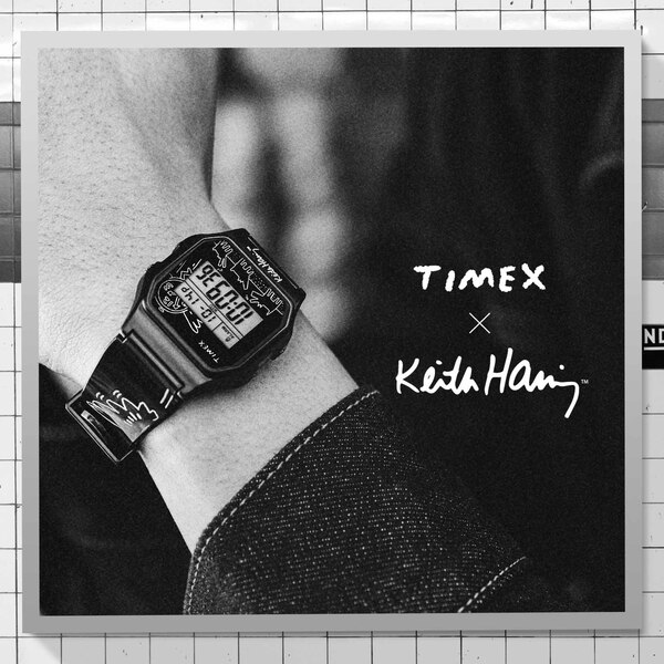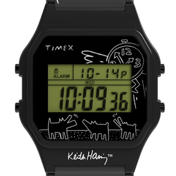 本国アメリカ、日本やヨーロッパでそれぞれ人気のあるベースモデルに、キース・へリングが実際にニューヨークの地下鉄構内の黒板に描いたTIMEXのロゴ入りアートをデザインに取り入れました。