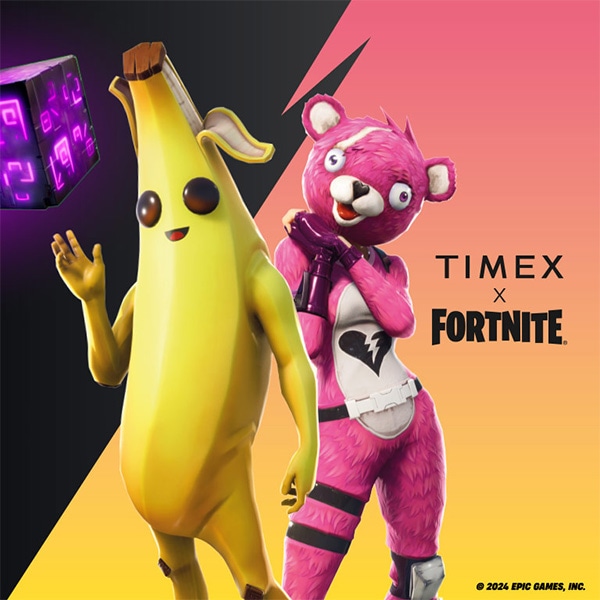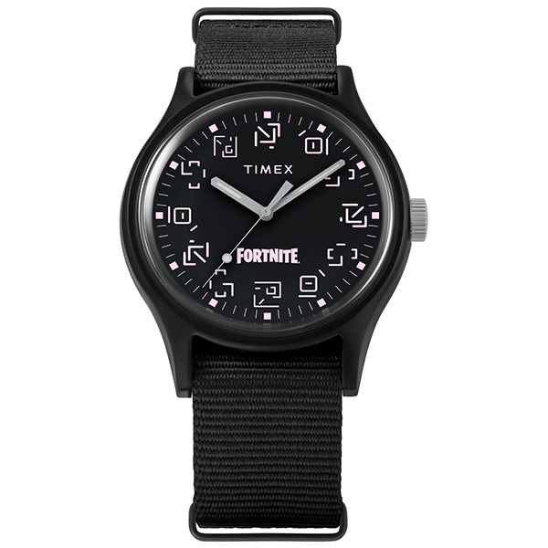 世界で約5億人がプレイする<フォートナイト>。タイメックスとのコラボレーションでは、ゲームだけでなくリアルでもフォートナイトを楽しめるデザインを取り入れています。この<MK1>は元々ミリタリーウォッチをベースにしていますが、伝統のデザインではなく<フォートナイト>のアイコンを大胆に使い、文字盤全面が発光するインディグロナイトライトが点灯するとそれらが浮かび上がる仕掛けが。ケース本体はアルミニウムなので軽量かつメタル感もあり、二層構造のファブリックストラップでいかにもギアっぽい仕上がりです。このウォッチを着けてチームを組んで、アクションに参加し、画面を越えて冒険を広げよう!