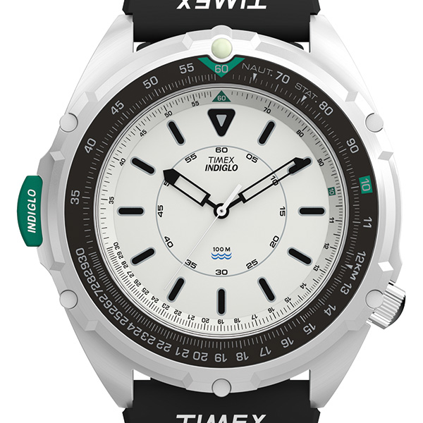 いわばこれまでマニアやごく一部の人しか注目しなかったアイテムに陽の目を浴びせながら、希少性をウリにした高額品商売ではなく、欲しい人々が買えるTIMEX。そんな新しいコンセプトで今回復刻されたのは、100m防水の46mmのステンレススチールケース、4時位置に配されたリューズ、肉厚なブラックのラバーストラップ、そして視認性が高いホワイトダイヤルのこちら。