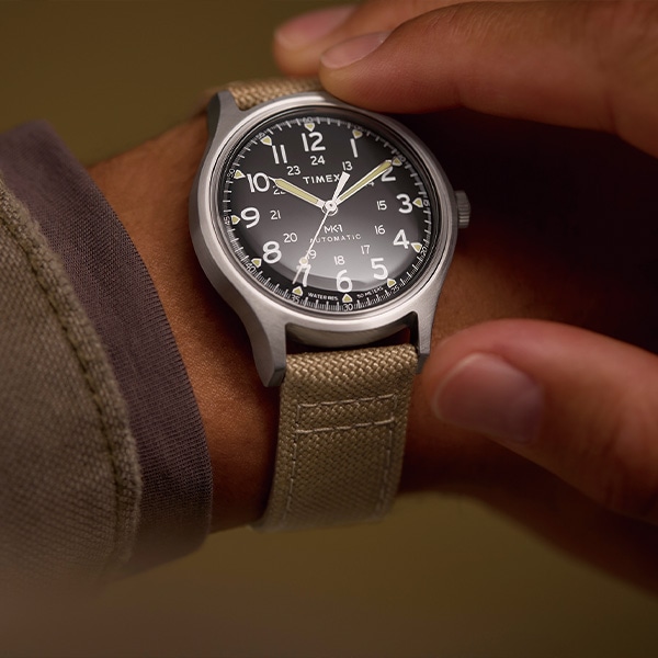 ミリタリーウォッチの永世定番<キャンパー>から派生したMK1。40mmサイズのSSケースに日本製自動巻きムーブメントを搭載し、文字盤デザインも一新されたニューモデルが登場です。ストラップには高い耐久性をもつコーデュラ素材を用いています。