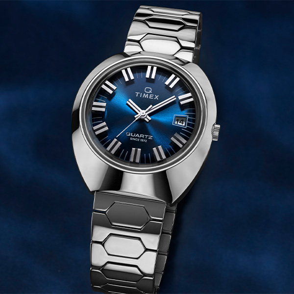 1972年から50年以上のときを経て現代に蘇ったこのモデルは、当時のデザインの大胆さを今に伝える一本です。39mmのぷっくりとしたトノー型ケースは煌めく全面ポリッシュ仕上げで、美しいブルーのサンレイダイヤルに宙に浮かぶような立体インデックスと対をなす同じデザインの針を組み合わせています。ほんのりとカーブを描くドーム型アクリル風防も、当時と同じデザインをそのまま再現。幾何学的なデザインが印象的なブレスレットは肌なじみが良く、レトロな魅力に現代的なエッジを加えたタイムレスなデザインに仕上っています。