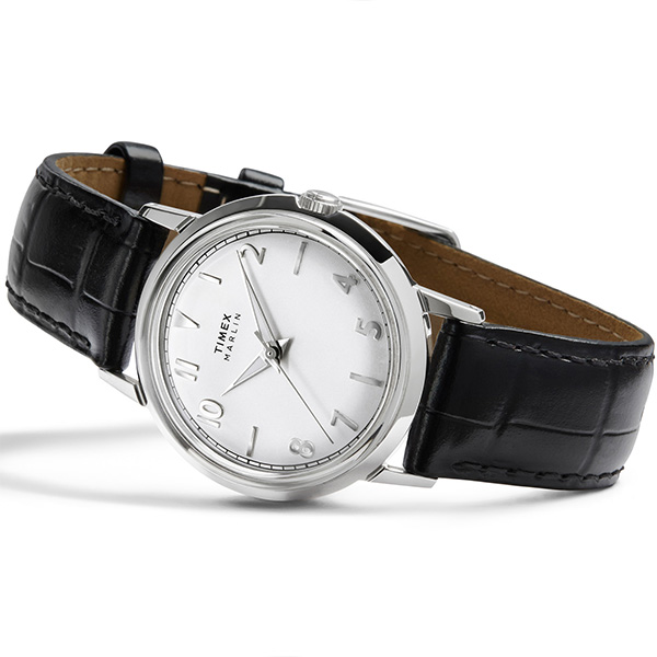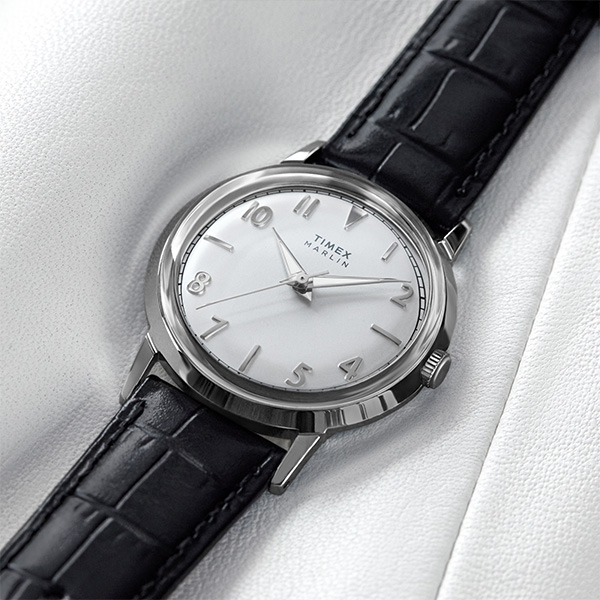 1950年代に誕生した名作「マーリン」をベースに、縁がカーブした凝った作りのボンベダイヤルや立体感のあるインデックスなど、当時のクラシックな魅力はそのままに、内部に精度の高いクォーツを搭載したニューモデルが登場。オリジナルと同じ34mm径のケースは重くなく装着感が良く、男性でも女性でも手首に収まるサイズ感は視覚的にも◎。細く品のあるシェイプのラグやドーム型のアクリル風防などとあわせ、トラッドにもカジュアルにも幅広いスタイルにマッチするタイムレスなデザインです。