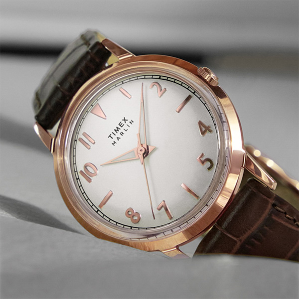 1950年代に誕生した名作「マーリン」をベースに、縁がカーブした凝った作りのボンベダイヤルや立体感のあるインデックスなど、当時のクラシックな魅力はそのままに、内部に精度の高いクォーツを搭載したニューモデルが登場。オリジナルと同じ34mm径のケースは重くなく装着感が良く、男性でも女性でも手首に収まるサイズ感は視覚的にも◎。細く品のあるシェイプのラグやドーム型のアクリル風防などとあわせ、トラッドにもカジュアルにも幅広いスタイルにマッチするタイムレスなデザインです。