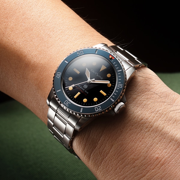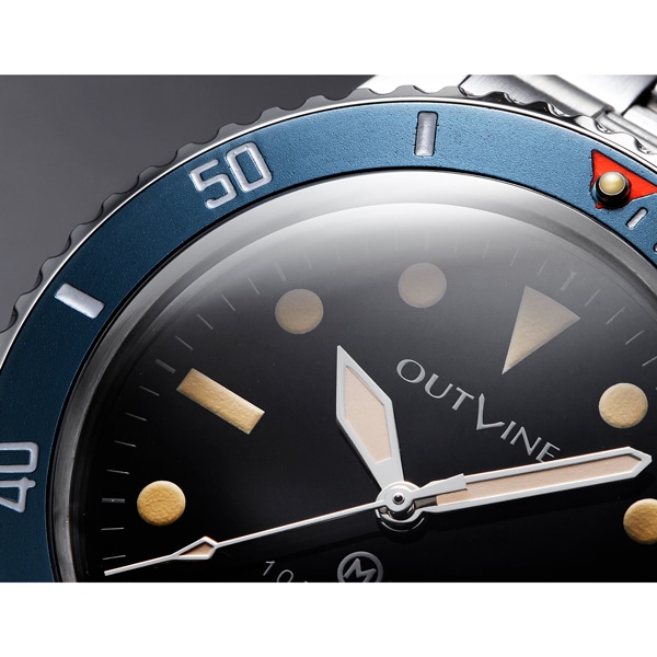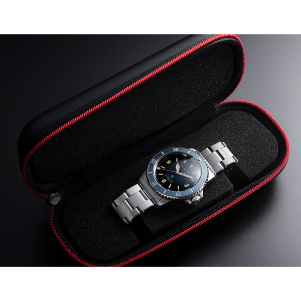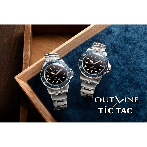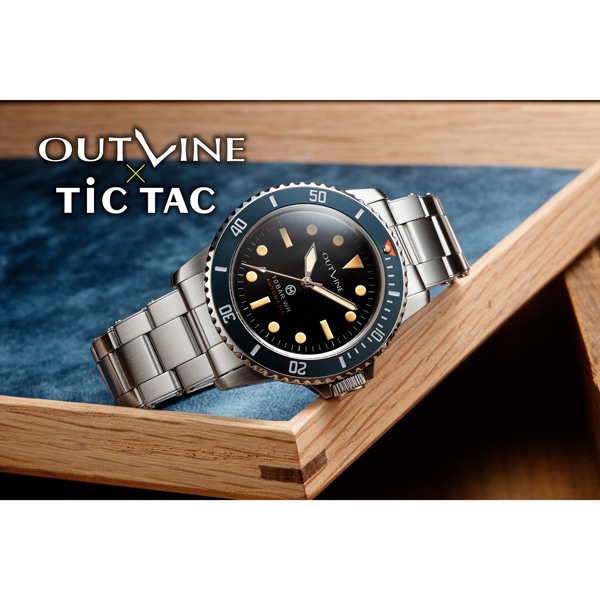 “ネイビーダイバー”は、かつてクラウドファンディングで1400万円以上という金額を達成した人気モデルの2ndバージョンです。そして今回はそれが“チックタック(TiCTAC)”との初コラボレーションモデルとして復活しました。1960年代の往年のダイバーズウオッチをモチーフに、ベゼルは一般的なブラックではなく、時計愛好家に珍重される独特の色合いで、経年変化によってネイビーカラーに退色したかのような雰囲気を再現している点が大きな特徴です。6時位置の丸の中に「M」を表示したマークは、チックタックが自社展開する時計ブランド“ムーブメント・イン・モーション”の頭文字からとったロゴマークのデザインをネイビーダイバー用にリデザイン。かつてイギリス軍向けに製造されたことで有名なサブマリーナー、Ref.5517(通称軍サブ)の同位置に表示されていた、夜光素材にトリチウムを使用していたことを示す「T」マークに倣い、今回は同様の書体デザインを採用することで、軍サブの雰囲気を楽しめるのも特筆すべき点です。