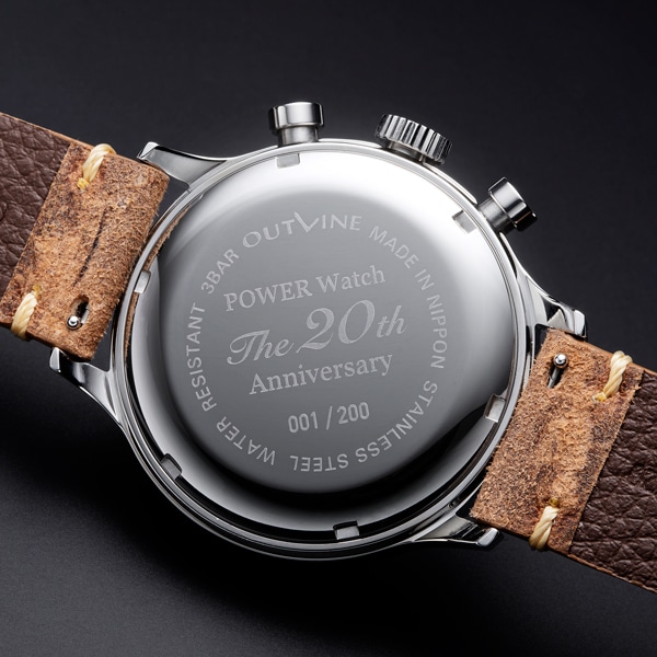 2001年に創刊した高級腕時計の専門誌「パワーウオッチ」の創刊20周年を祝して特別製作したアニバーサリーモデルです。1940年代に空軍士官向けに開発されたと言われ、通称“フライングオフィサー”の呼び名でもよく知られる2カウンタークロノグラフの名機をモチーフに、古典的な雰囲気にこだわった作りました。最大の特徴は、クロノグラフ機構に加えて、文字盤外周に世界23都市の名前が配されており、同時に時差の違う二つの国の時刻を表示できる機能を有している点です。つまり日本の時刻を基本として、文字盤に記載されている23のどれかひとつの都市の時刻を常に確認できるようにしました。ムーヴメントにはセイコーのメカクォーツクロノグラフ、VK64を採用。クロノグラフの計測針については1秒毎に運針するステップ運針ではなく、機械式のクロノグラフムーヴメントのように滑らかな動きのスイープ運針となります。さらに計測停止後にクロノグラフ秒針をゼロリセットする際も、機械式モデルのようにリセットボタンで瞬時に帰針する点は、他社製のメカクォーツにはない魅力です。