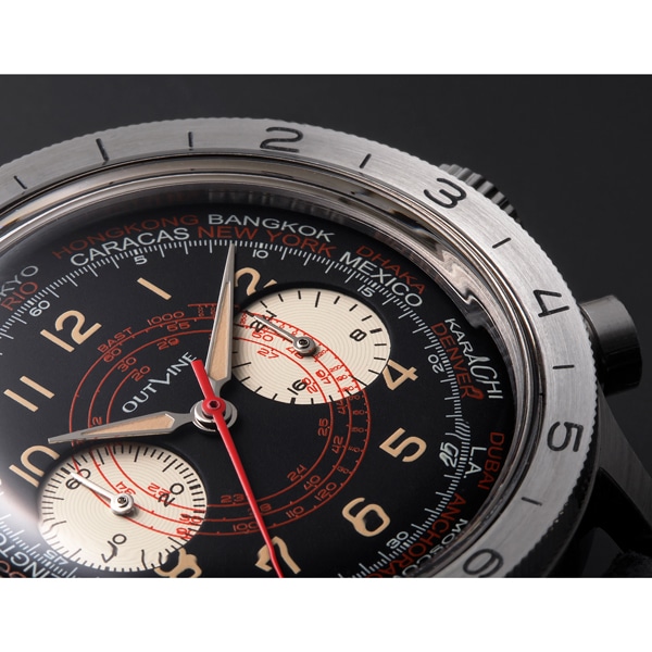 2001年に創刊した高級腕時計の専門誌「パワーウオッチ」の創刊20周年を祝して特別製作したアニバーサリーモデルです。1940年代に空軍士官向けに開発されたと言われ、通称“フライングオフィサー”の呼び名でもよく知られる2カウンタークロノグラフの名機をモチーフに、古典的な雰囲気にこだわった作りました。最大の特徴は、クロノグラフ機構に加えて、文字盤外周に世界23都市の名前が配されており、同時に時差の違う二つの国の時刻を表示できる機能を有している点です。つまり日本の時刻を基本として、文字盤に記載されている23のどれかひとつの都市の時刻を常に確認できるようにしました。ムーヴメントにはセイコーのメカクォーツクロノグラフ、VK64を採用。クロノグラフの計測針については1秒毎に運針するステップ運針ではなく、機械式のクロノグラフムーヴメントのように滑らかな動きのスイープ運針となります。さらに計測停止後にクロノグラフ秒針をゼロリセットする際も、機械式モデルのようにリセットボタンで瞬時に帰針する点は、他社製のメカクォーツにはない魅力です。