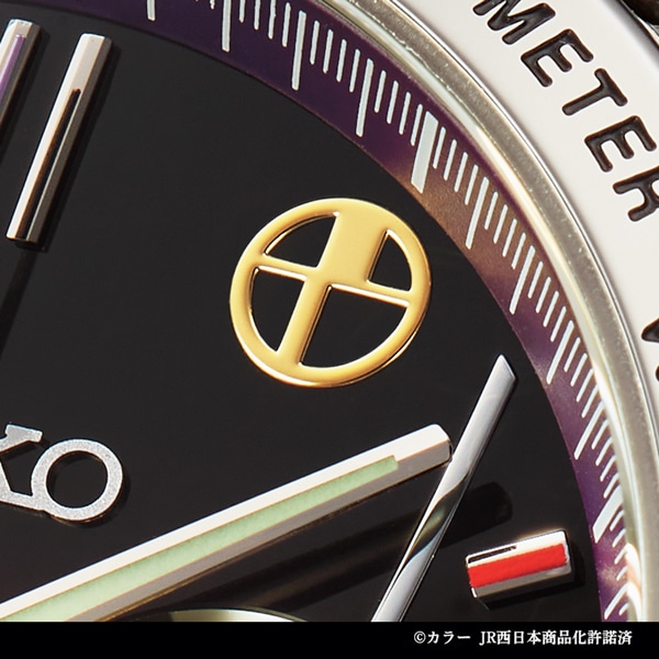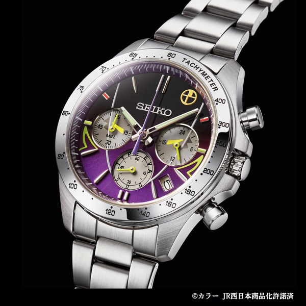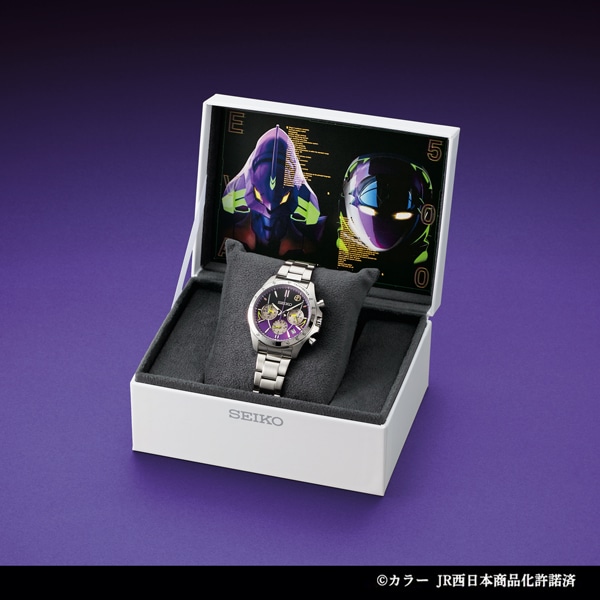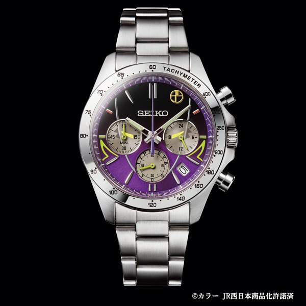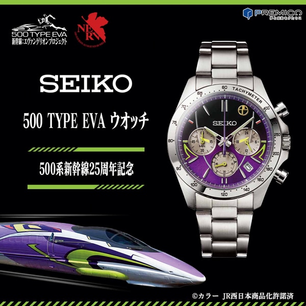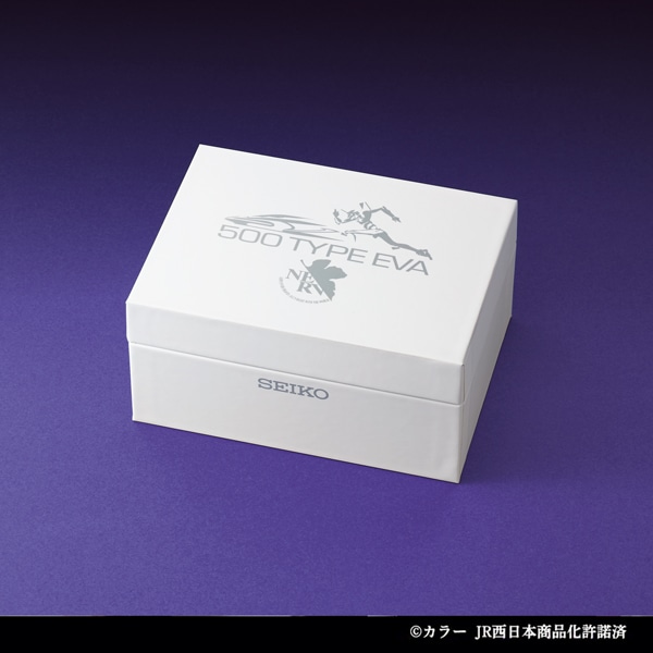 2015年11月から2年半にわたって運行され人気を博したエヴァンゲリオン新幹線「500 TYPE EVA」が、500系新幹線の25周年を記念してセイコーとコラボレーション!スタイリッシュな腕時計になりました。500系の象徴であるロングノーズをイメージした印ダイヤルを結ぶ放物線とヘッドライトのモチーフ、初号機のカラーリングで正面から見た「500 TYPE EVA」を表現。数量限定5000点、エディションナンバー入り。天面に公式ロゴとNERVのマークがデザインされた特製ボックスに収めてお届けします。