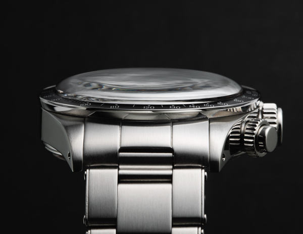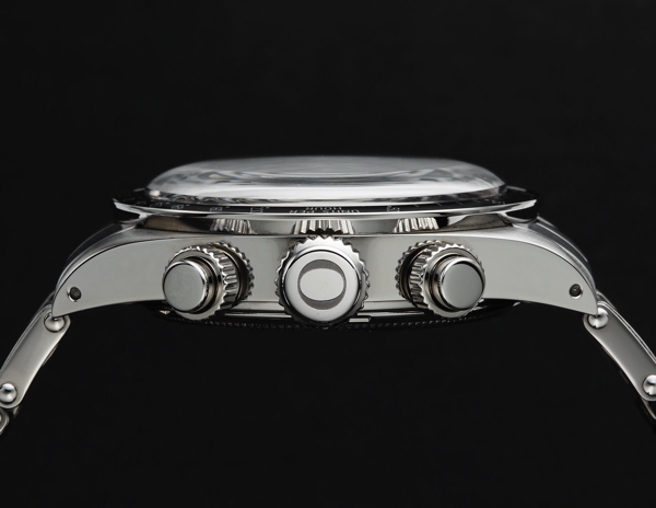 裏ブタからベゼルまでのケース厚は11.8mm、ドーム形風防を含んでも13.1mmとオリジナルに近いサイズを実現(拡大写真だとどうしても厚く見えてしまいますが)。リューズ、プッシュボタンのトップおよびケースサイドはリベットブレスのコマと同様に鏡面仕上げを施しています(動画参照)。また、ラグのサイドにはブレスレットの着脱に便利なバネ棒用の穴を設けました。これもオリジナルと同じ仕様です。