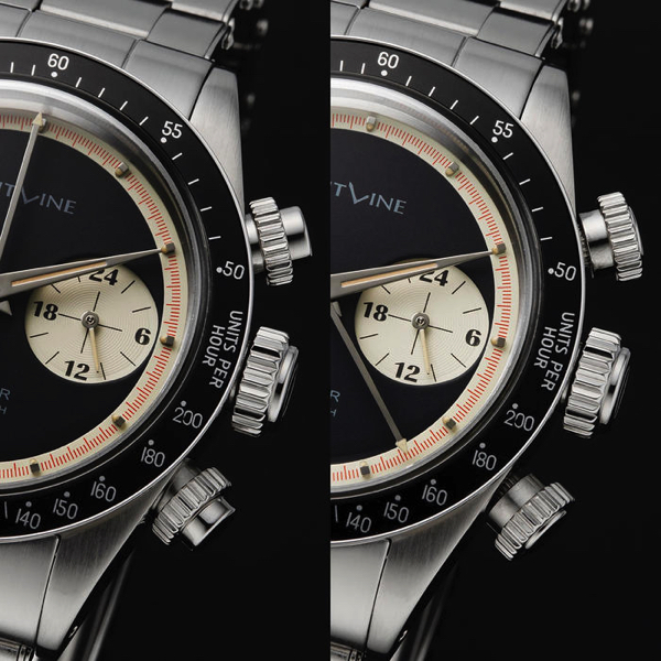 2時位置と4時位置にあるクロノグラフの操作用プッシュボタンをご覧ください。3時位置にある時刻調整用のリューズはネジ込み式なのに加えて、こちらもオリジナル同様にネジ留め式にしました。写真左のネジが締まった状態ではボタンはロックされていて押せません。ネジを緩めた写真右の状態でロックが解除され、プッシュボタンを押すことができるようになり、クロノグラフのスタートストップ&リセットが行えます。